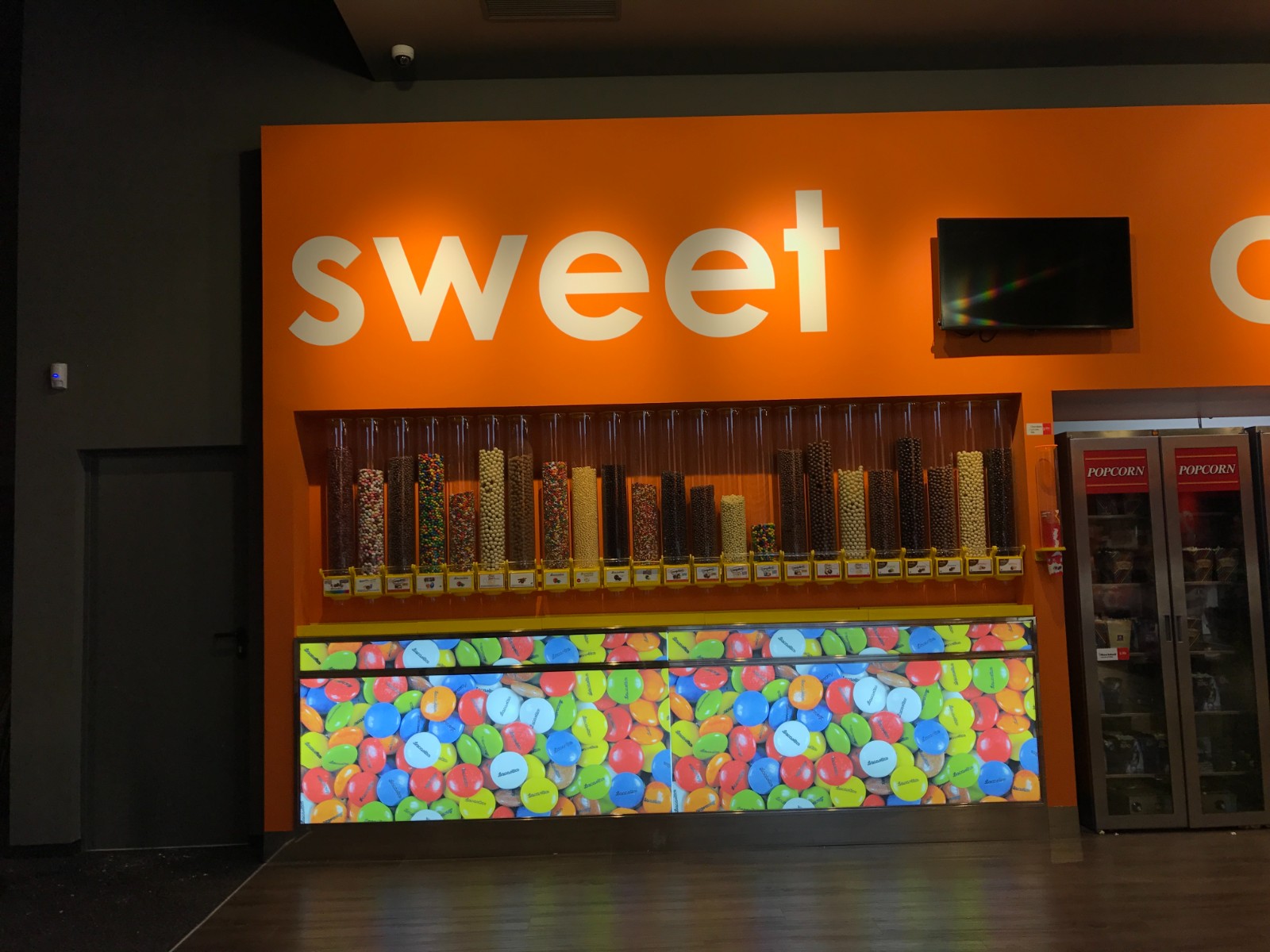 Reforma de la tienda de caramelos existente (Megacandy) de Kinépolis Alcobendas. Colocación del cartel, sustitución de la puerta giratoria por puertas correderas y redistribución de los espacios según sus necesidades.