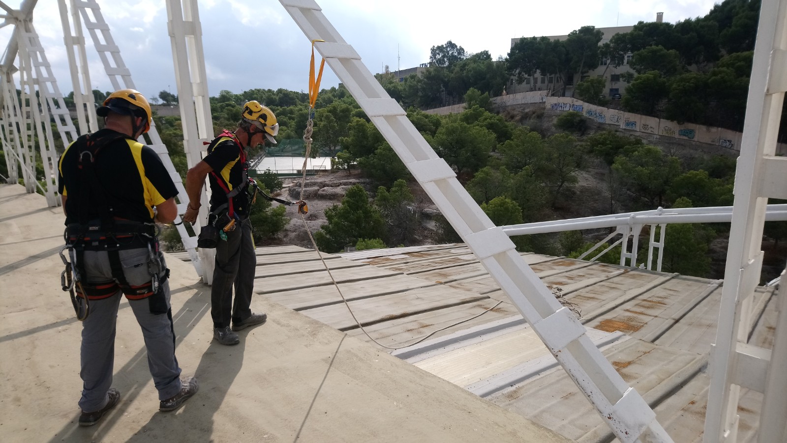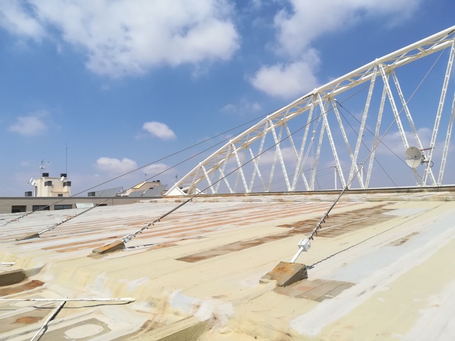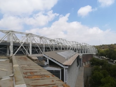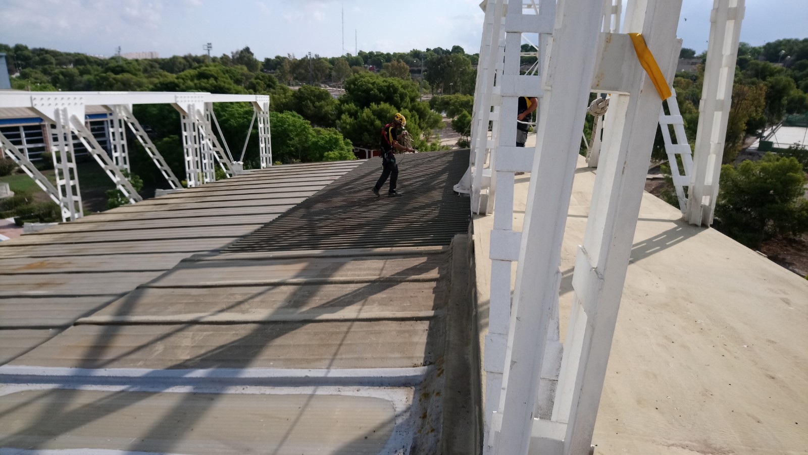 Impermeabilización de la cubierta del Centro de Tecnificación Deportiva, se trata de una cubierta de acero galvanizado que presenta graves filtraciones de agua y que para su solución se opta por la retirada y su posterior reposción del aislamiento dañado con XPS, instalacion de lamina asfaltica, silkafill proyectado.